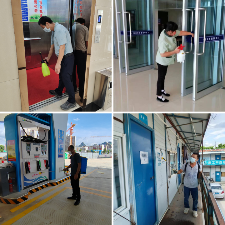 消殺人員全面對(duì)集團(tuán)辦公區(qū)域樓道、會(huì)議室、衛(wèi)生間等部位進(jìn)行環(huán)境消殺,對(duì)辦公室門(mén)把窗鎖、電腦鍵盤(pán)鼠標(biāo)、座椅扶手等頻繁接觸部位進(jìn)行清潔消毒;對(duì)物管小區(qū)大門(mén)、單元入戶門(mén)、小區(qū)綠化帶、樓梯通道、電梯轎廂、樓梯扶手、垃圾桶、信報(bào)箱等各公共區(qū)域進(jìn)行全面擦洗消毒,及時(shí)清運(yùn)小區(qū)垃圾,清理衛(wèi)生死角;對(duì)平安立體停車(chē)庫(kù)、平安加油站、姑婆山小鎮(zhèn)路花新村項(xiàng)目、城東污水處理廠項(xiàng)目等開(kāi)展防控消殺。僅一天時(shí)間,城投集團(tuán)共消殺辦公場(chǎng)所處,項(xiàng)目工地個(gè),物管小區(qū)個(gè),進(jìn)行了“無(wú)死角、無(wú)盲區(qū)、全覆蓋”的地毯式消毒作業(yè)。