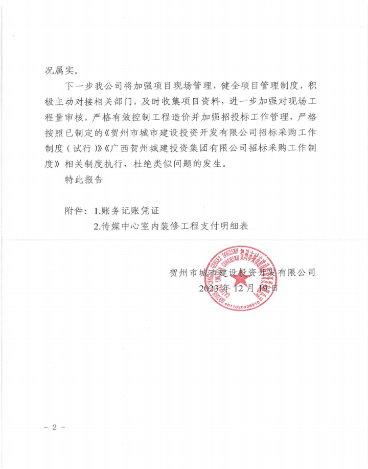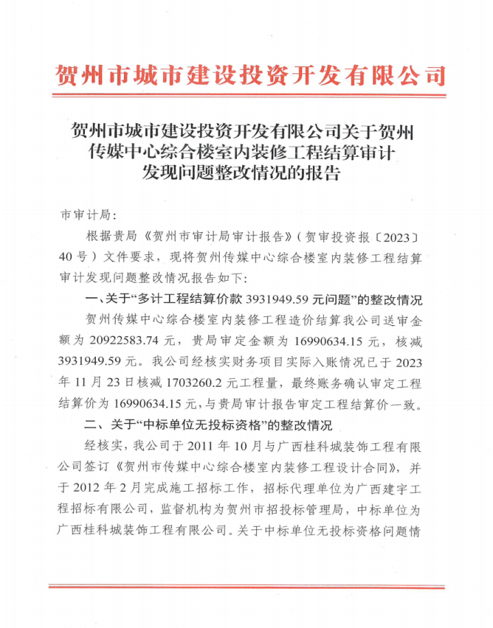 關(guān)于賀州傳媒中心綜合樓室內(nèi)裝修工程結(jié)算審計(jì)發(fā)現(xiàn)問題整改情況的報(bào)告