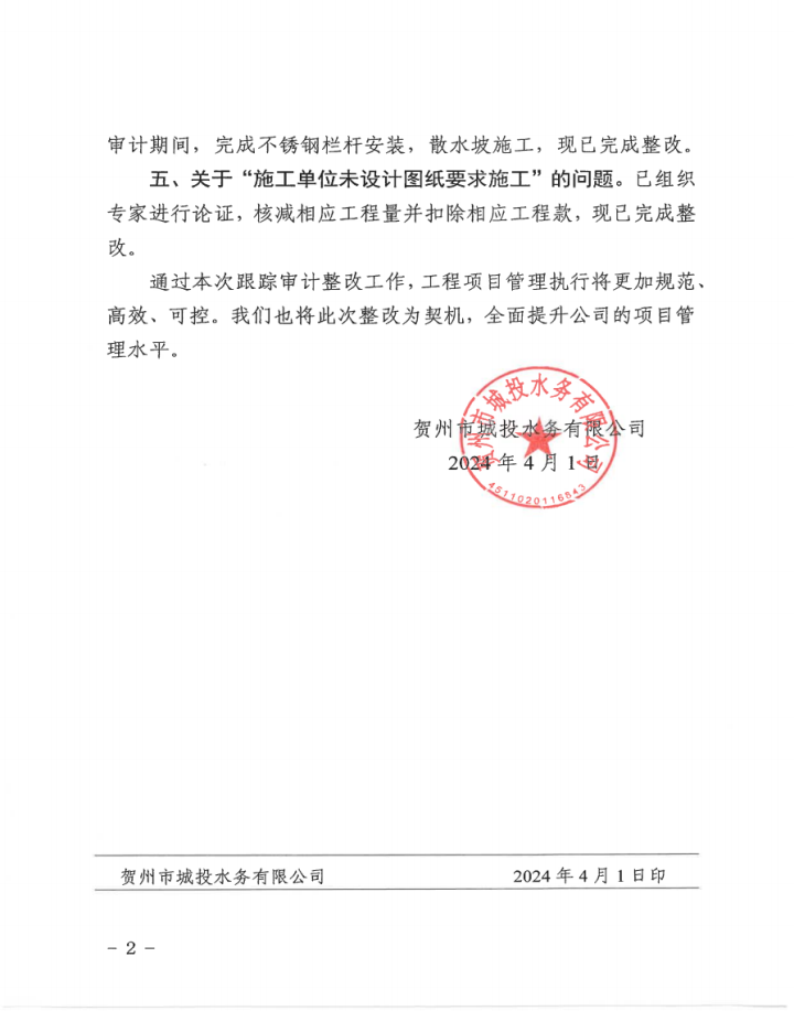 上一篇:賀州市城市品質(zhì)提升改造工程財(cái)務(wù)收支及項(xiàng)目執(zhí)行情況審計(jì)整改情況公告